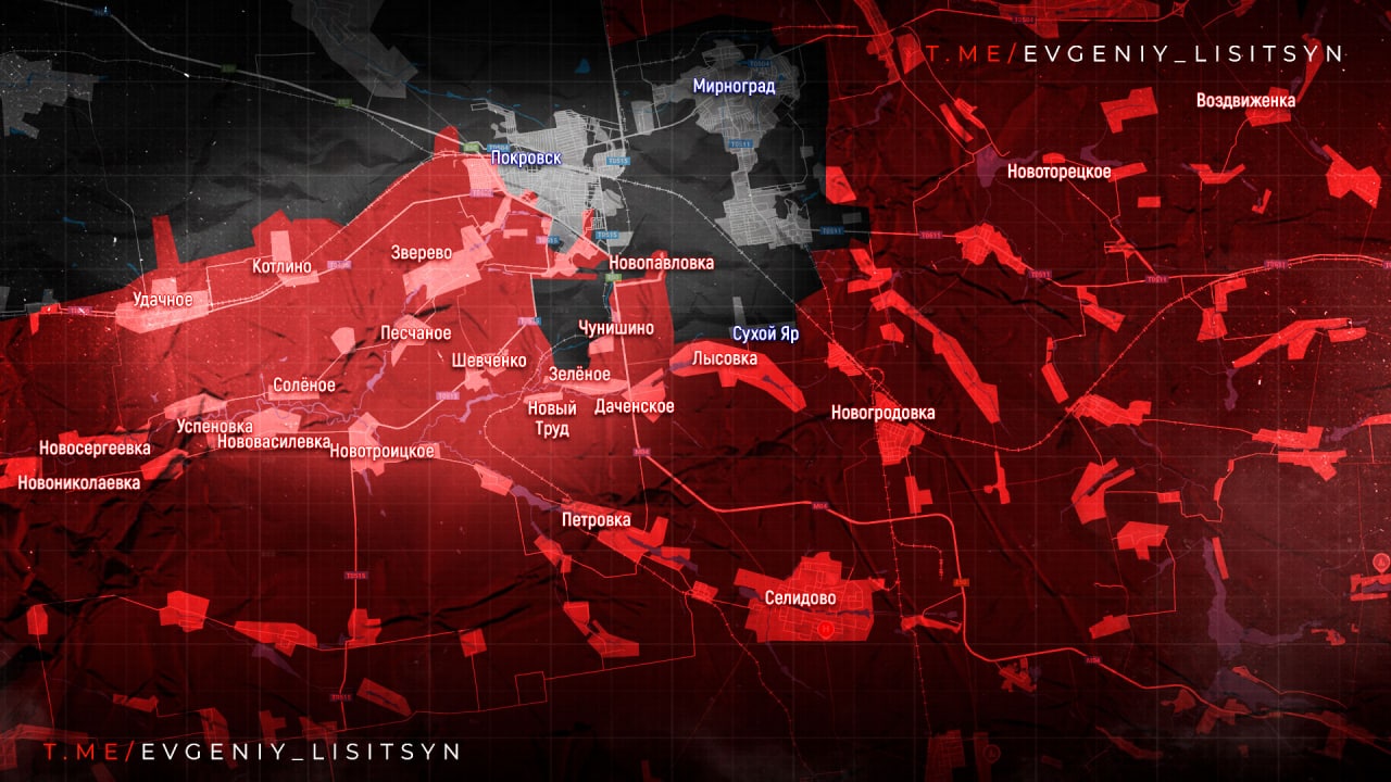 Бои в треугольнике Удачное – Котлино – шахта «Покровская». Наши заняли западную часть Покровска и вышли к Гришино. Идёт наступление на Мирноград и Светлое, противник держится в Родинском.