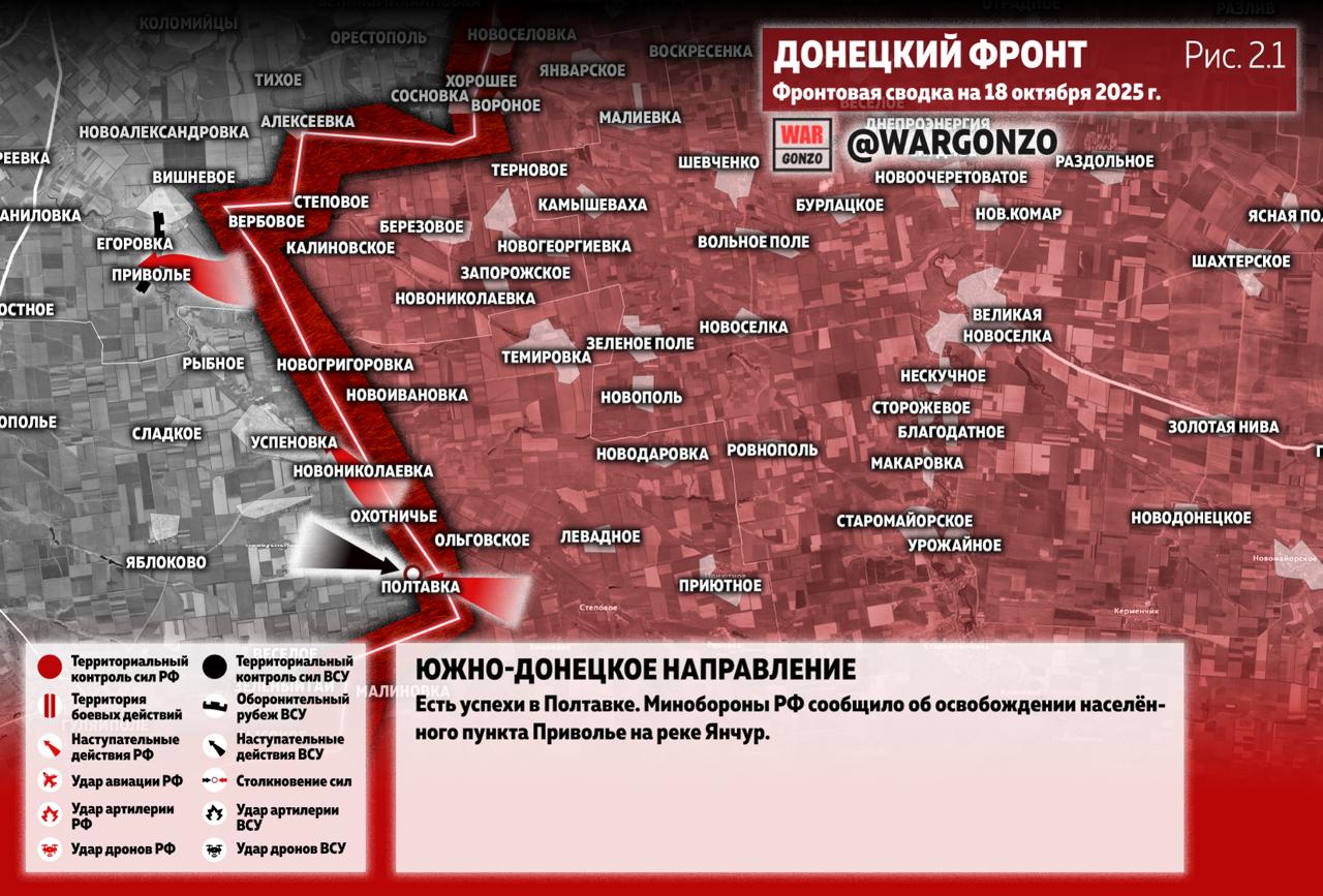 На Южно-Донецком направлении есть успехи в Полтавке. Минобороны РФ сообщило об освобождении населённого пункта Приволье на реке Янчур. (Рис. 2.1)