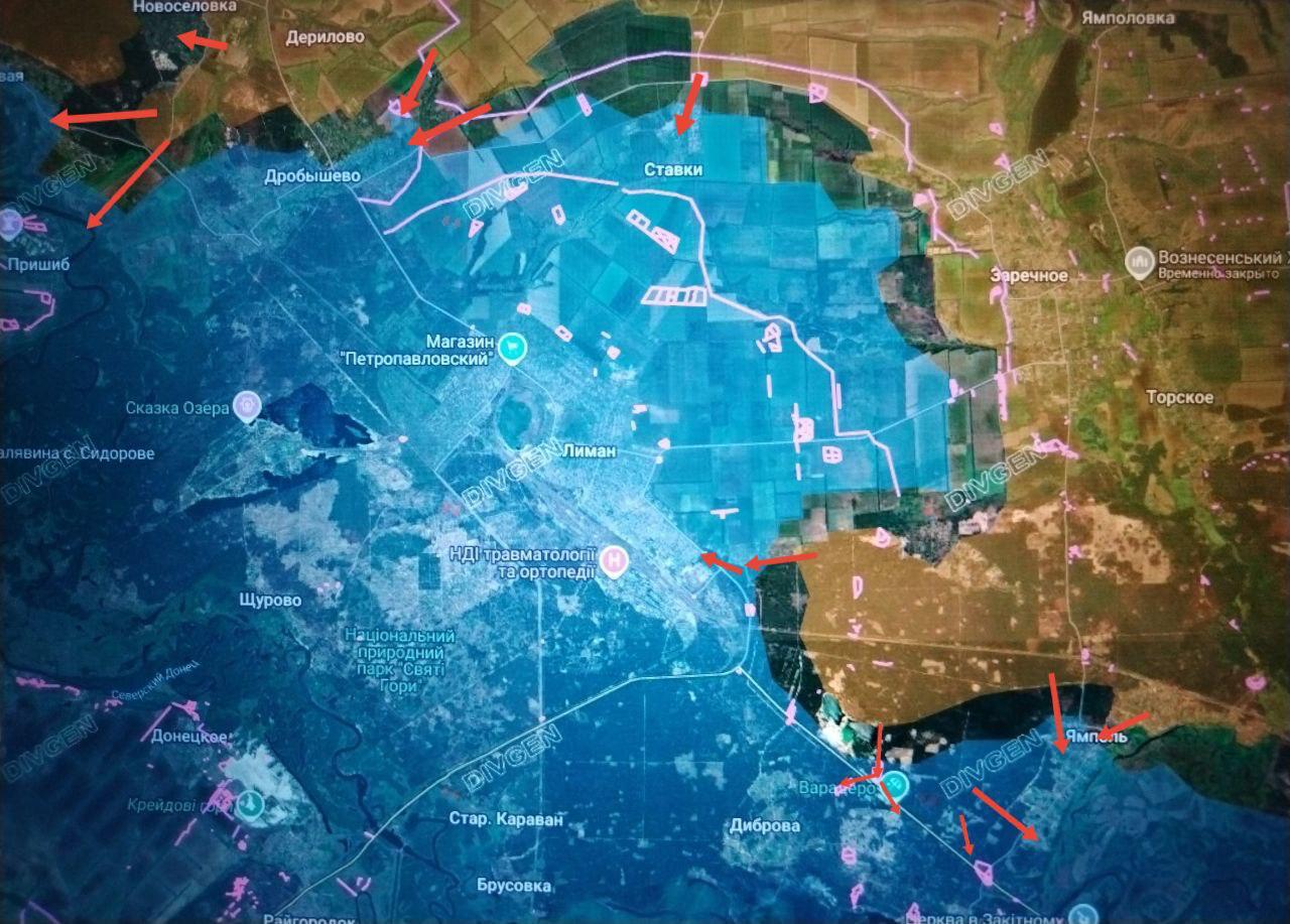 Юго-восточнее Красного Лимана и песчаного карьера ВС РФ взяли опорные пункты противника и атакуют в направлении н.п. Диброва, через Ямпольский лес вошли в южную часть Ямполя и начали бои за опорный пункт у перекрёстка на южном выезде.