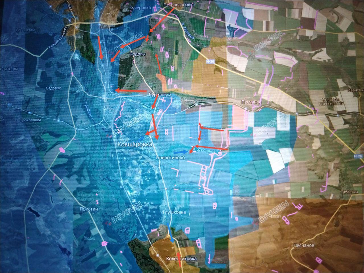 Севернее Новоосиново ВС РФ из северной части Куриловки (на правом берегу р. Лозоватка) продвинулись южнее, взяли два опорных пункта, выйдя в тыл ещё двум севернее Ковшаровки и ведут бои в её северной части. Этот прорыв несёт угрозу окружения подразделений противника, упорно обороняющиеся в южной части Куриловки и выхода с тыла к южной части Купянска-Узлового и переправе в районе Осиново.