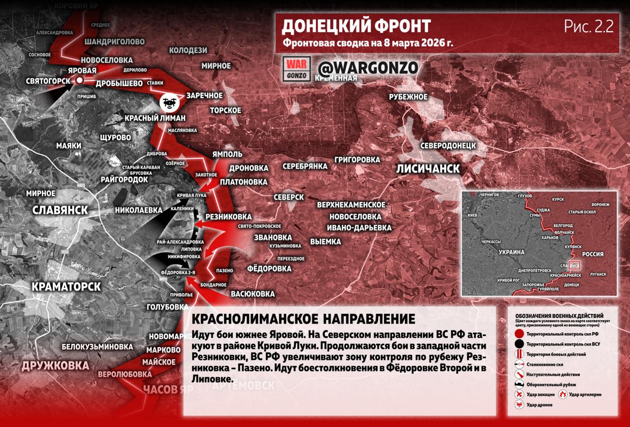 На Краснолиманском направлении идут бои южнее Яровой. На Северском направлении ВС РФ атакуют в районе Кривой Луки. Продолжаются бои в западной части Резниковки, ВС РФ увеличивают зону контроля по рубежу Резниковка – Пазено. Идут боестолкновения в Фёдоровке Второй и в Липовке. (Рис. 2.2)