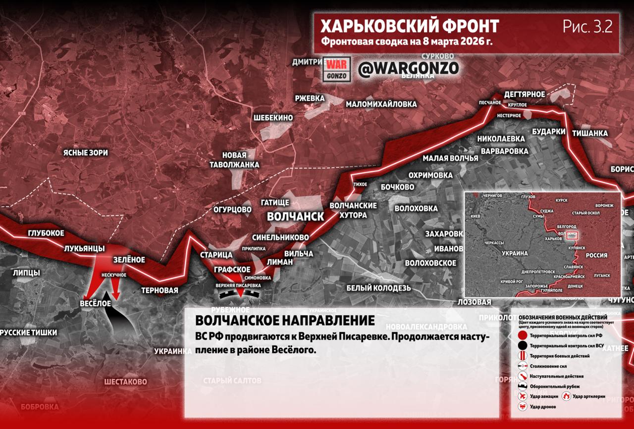 На Волчанском направлении ВС РФ продвигаются к Верхней Писаревке. Продолжается наступление в районе Весёлого. (Рис. 3.2)