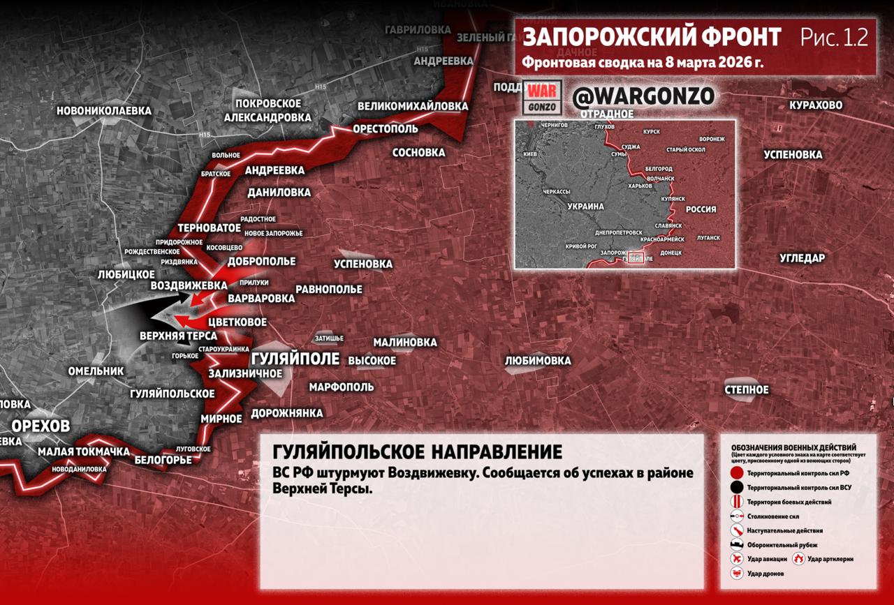 На Гуляйпольском направлении ВС РФ штурмуют Воздвижевку. Сообщается об успехах в районе Верхней Терсы. (Рис. 1.2)