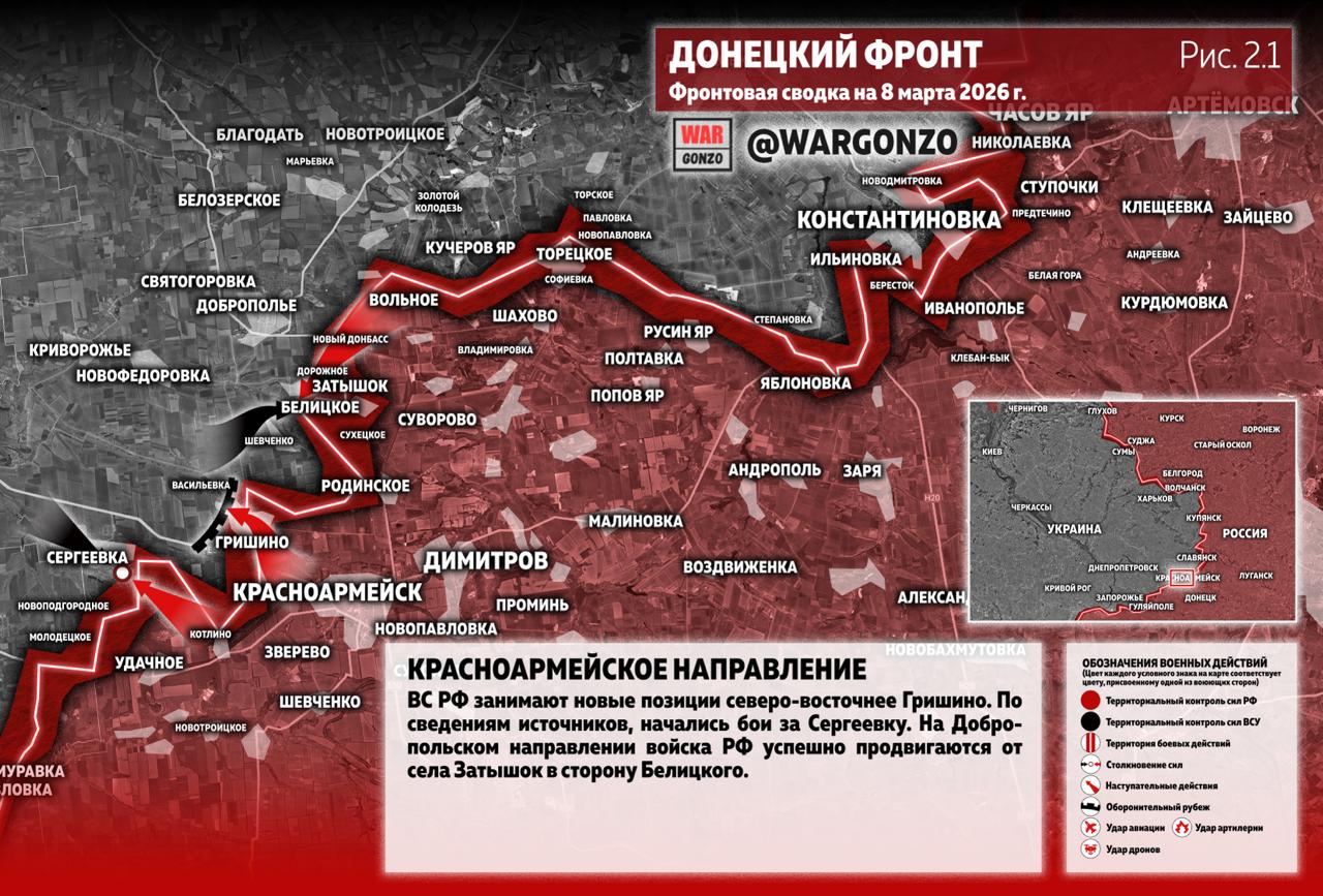 На Красноармейском направлении ВС РФ занимают новые позиции северо-восточнее Гришино. По сведениям источников, начались бои за Сергеевку. На Добропольском направлении войска РФ успешно продвигаются от села Затышок в сторону Белицкого. (Рис. 2.1)