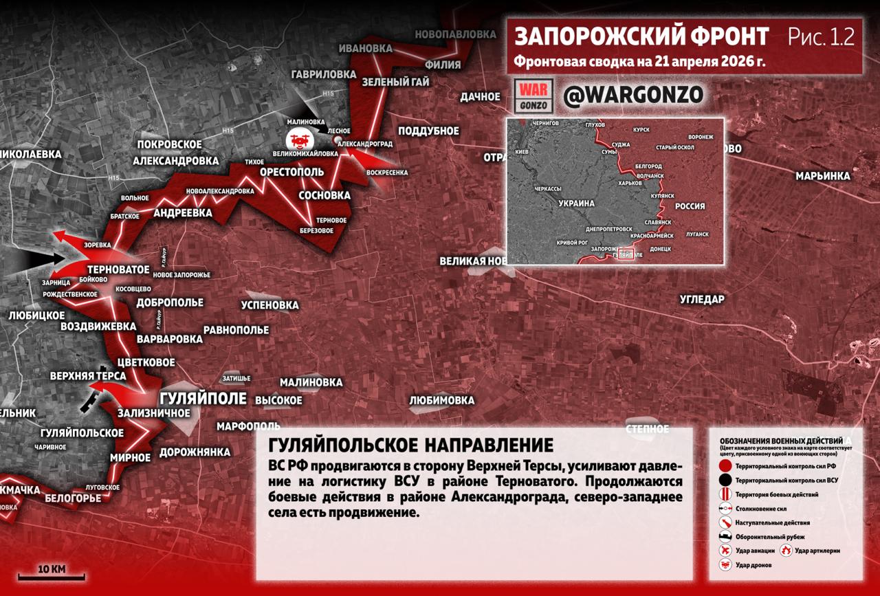 На Гуляйпольском направлении ВС РФ продвигаются в сторону Верхней Терсы, оказывают давление на логистику ВСУ в районе Терноватого. Продолжаются боевые действия в районе Александрограда, северо-западнее села есть продвижение. (Рис. 1.2)