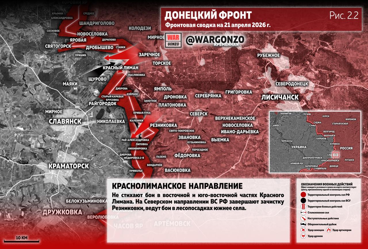 Не стихают бои в восточной и юго-восточной частях Красного Лимана. На Северском направлении ВС РФ завершают зачистку Резниковки, ведут бои в лесопосадках южнее села. (Рис. 2.2)
