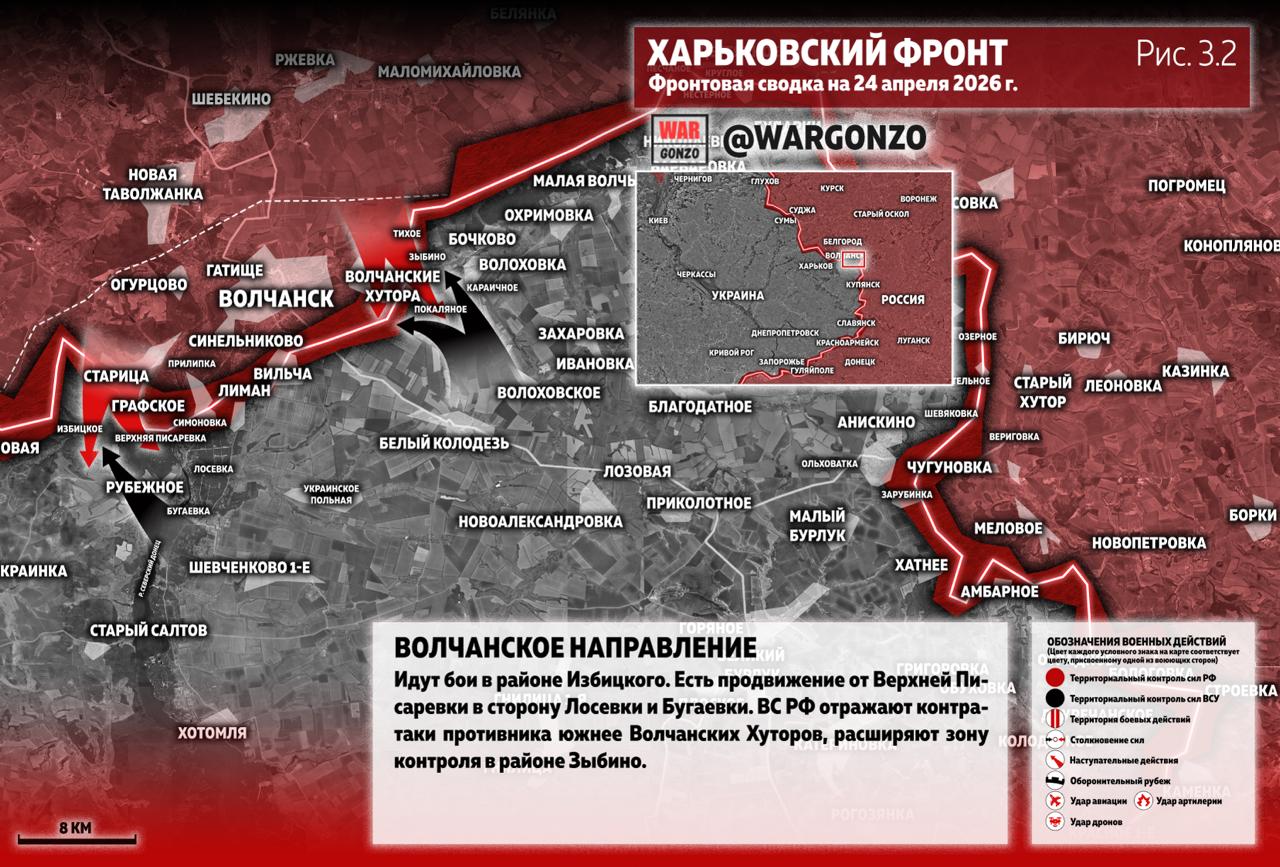 На Волчанском направлении идут бои в районе Избицкого. Есть продвижение от Верхней Писаревки в сторону Лосевки и Бугаевки. ВС РФ отражают контратаки противника южнее Волчанских Хуторов, расширяют зону контроля в районе Зыбино. (Рис. 3.2)