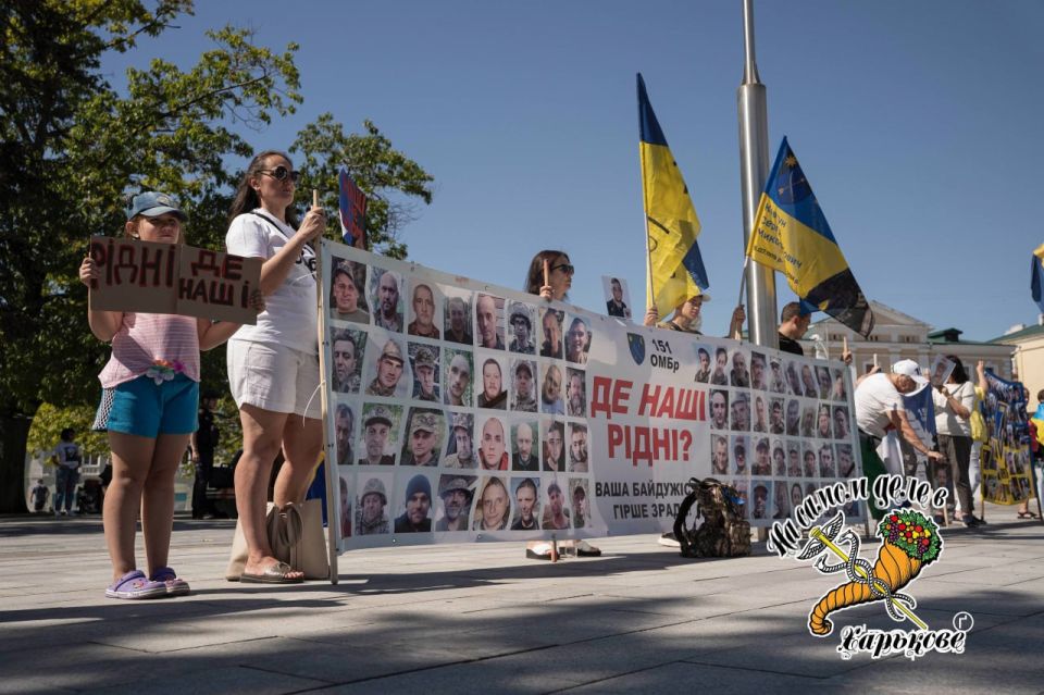 Родственники требуют от зелёной хунты вернуть без вести пропавших хероев.... Площади Свободы им уже мало, как и места у памятника Шевченко. Теперь они оккупировали и площадь Конституции.