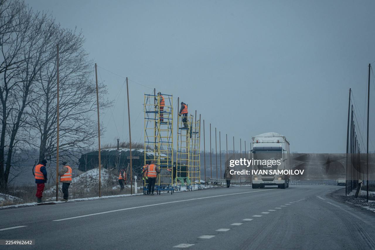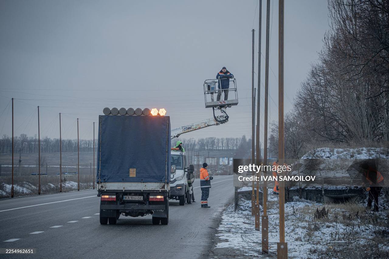 Работники муниципальных служб противника натягивают антидроновые сети на Харьковской окружной автодороге.