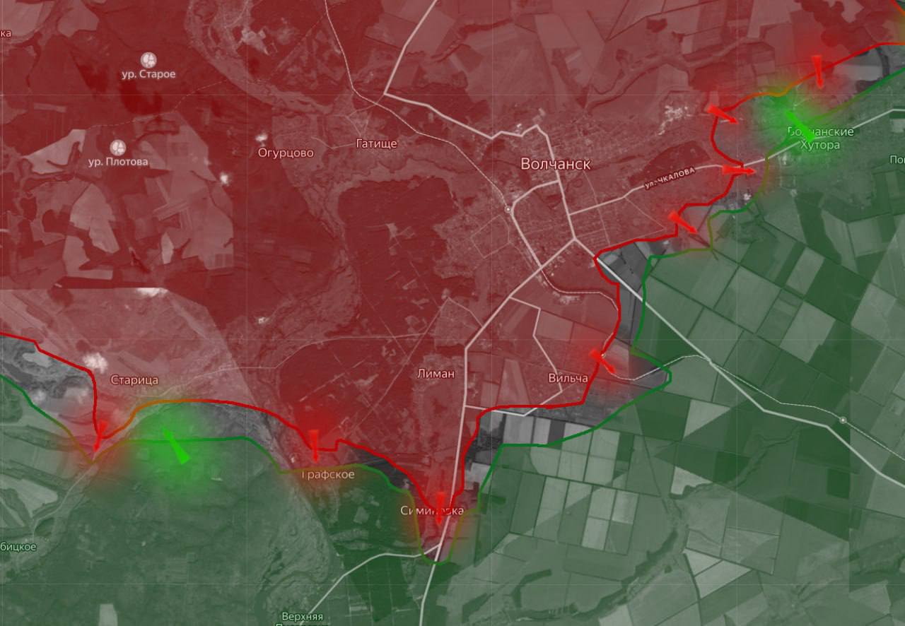 «На Южно-Слобожанском направлении российские войска продвинулись в лесном массиве возле Старицы. Также продвижение ВС РФ фиксируется юго-западнее Симиновки, где они захватили позицию 120 обр ТРО, и в районе Волчанских Хуторов».Вражеские сводки