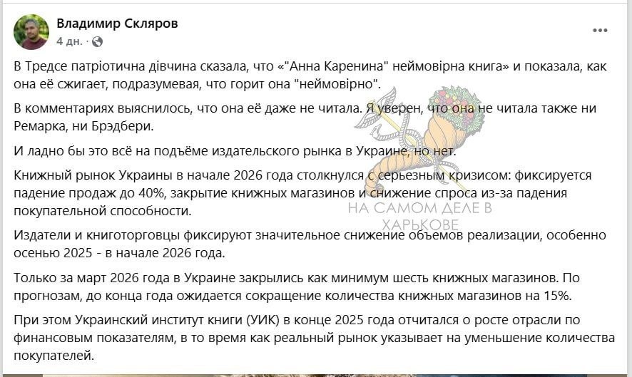 «Патриотична дивчина» назвала «Анну Каренину» невероятной книгой из-за того, что она хорошо горит. По её мнению, это «потужно» и перемога над москалями.