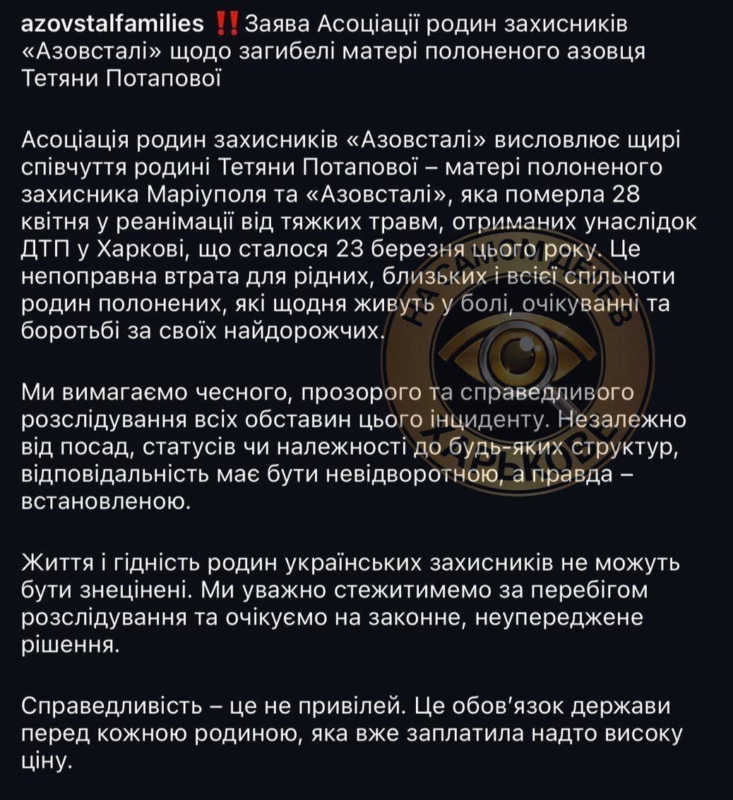 Погибшая – мать военнопленного из Азова*. По данным ГБР, за рулем был местный правоохранитель. В харьковском сообществе семей «хероив Азовстали» говорят, что женщину сбил сотрудник СБУ и требуют наказать преступника: как обычно на Украине, дело пытаются замять.