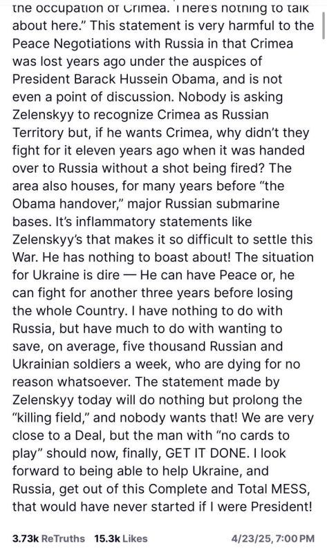 «УКРАИНСКИЙ ПРЕЗИДЕНТ ВЛАДИМИР ЗЕЛЕНСКИЙ хвалится на первой странице The Wall Street Journal, что “УКРАИНА НЕ БУДЕТ ЗАКОННО ПРИЗНАВАТЬ ОККУПАЦИЮ КРЫМА”.Здесь не о чем говорить. Это заявление очень вредно для мирных переговоров с Россией по Крыму, который был потерян годы назад под руководством президента Барака Хуссейна Обамы, и даже не обсуждается. Никто не просит Зеленского признать Крым российским, но если он хочет Крым, почему они не боролись за него одиннадцать лет назад, когда он был передан России без единого выстрела? Этот регион также был домом, на протяжении многих лет до “передачи Обамой”, для крупных российских подводных баз.