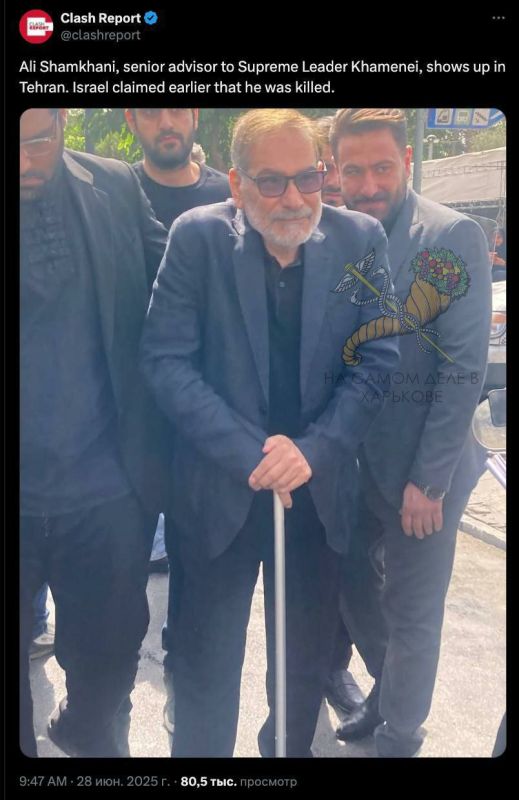 Теперь, оказывается, главный советник верховного лидера аятоллы Хаменеи, -- Али Шамхани, тоже жив. В СМИ публикуют его фото в Тегеране с палочкой и в окружении охраны. Хотя Израиль заявлял, что он «умер от ран».