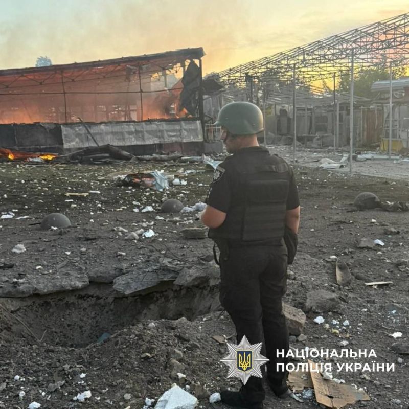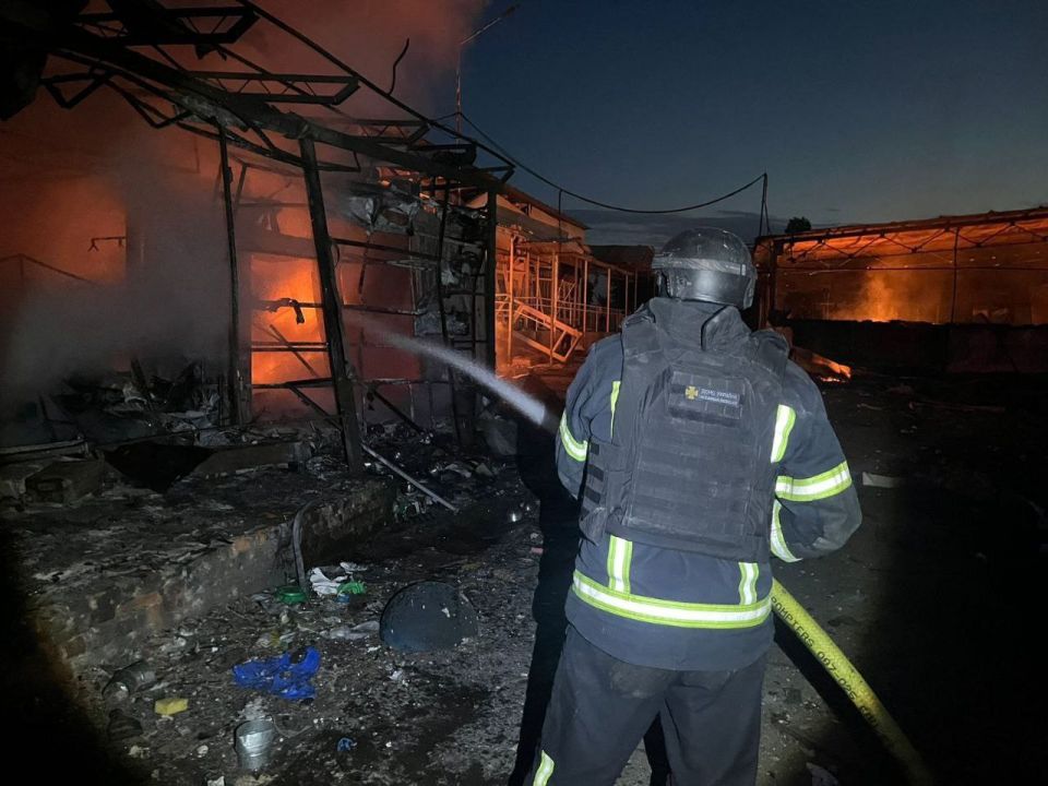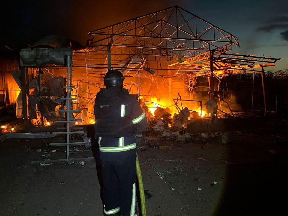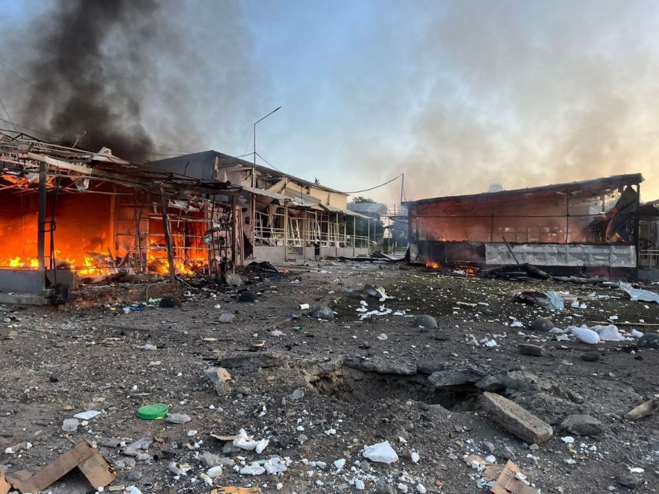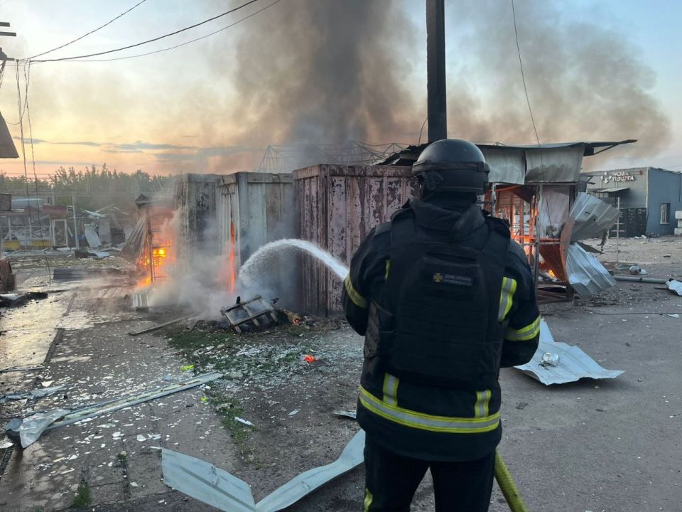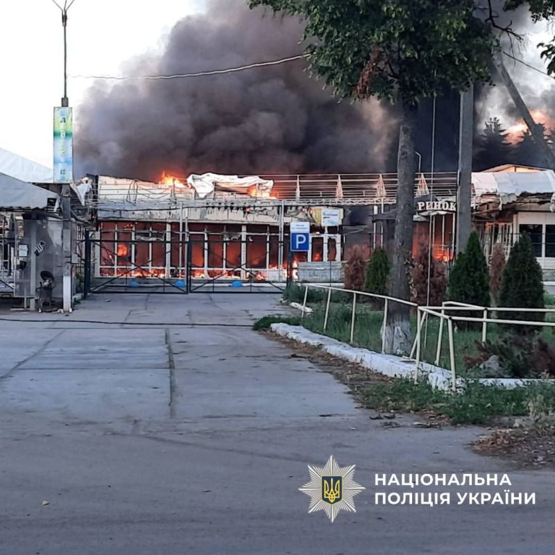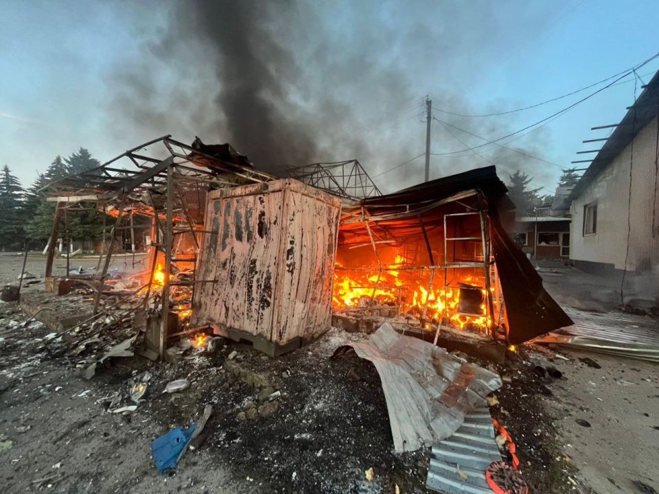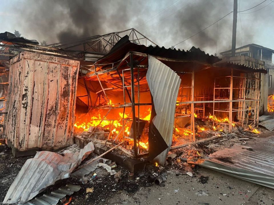 Великий Бурлук Харьковская область. Вчерашний прилёт по территории рынка, в результате горели торговые точки, повреждено отделение «Новой почты».