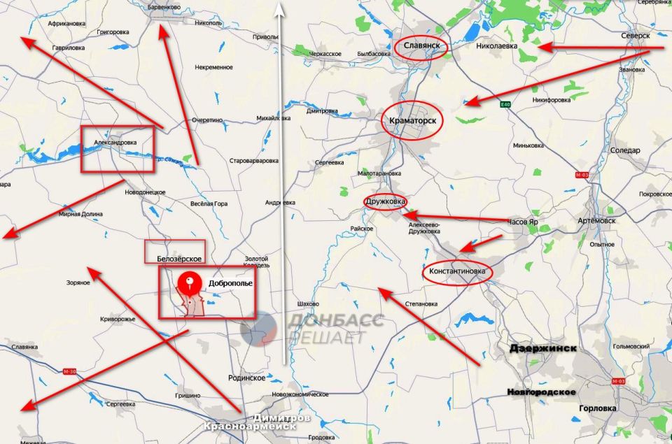 Наступательная линия севернее Красноармейска и Димитрова в направлении Белецкое – Доброполье – Белозёрск отрезает от днепропетровского участка границы Краматорск, Славянск, Дружковку и Константиновку.