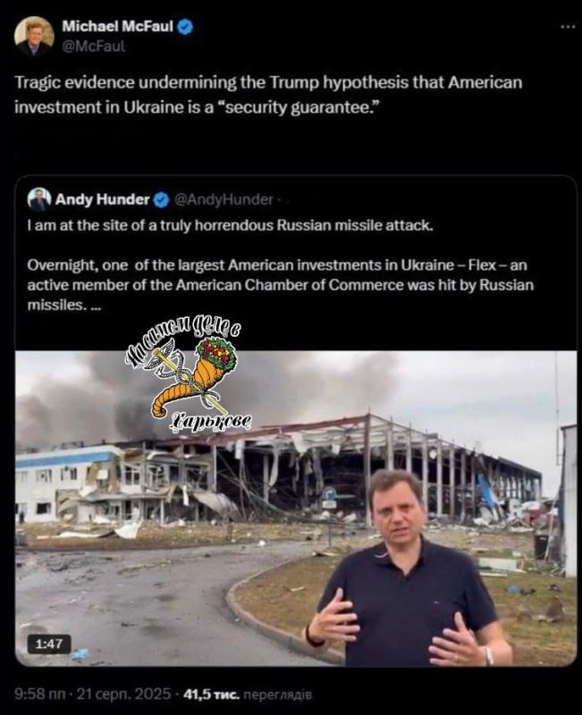 Этот инцидент вызвал бурную реакцию бывшего посла США Майкла Макфола, который истерично заявил, что «трагические факты разрушают гипотезу Трампа о том, что американские инвестиции на Украину — это "гарантия безопасности". Если бы Иран нанёс удар по американскому объекту на Ближнем Востоке, Трамп бы ответил»