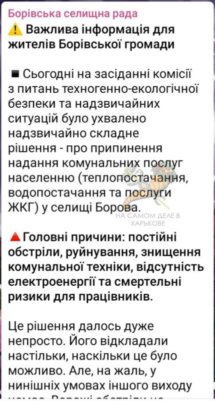 Руководства в поселке нет давно, полиция не работает. Газ еще есть, а вот воды нет. ВСУшники обокрали насосную станцию на водоканале, разобрали ее и вынесли запчасти и аккумуляторы. Закрылись все магазины.