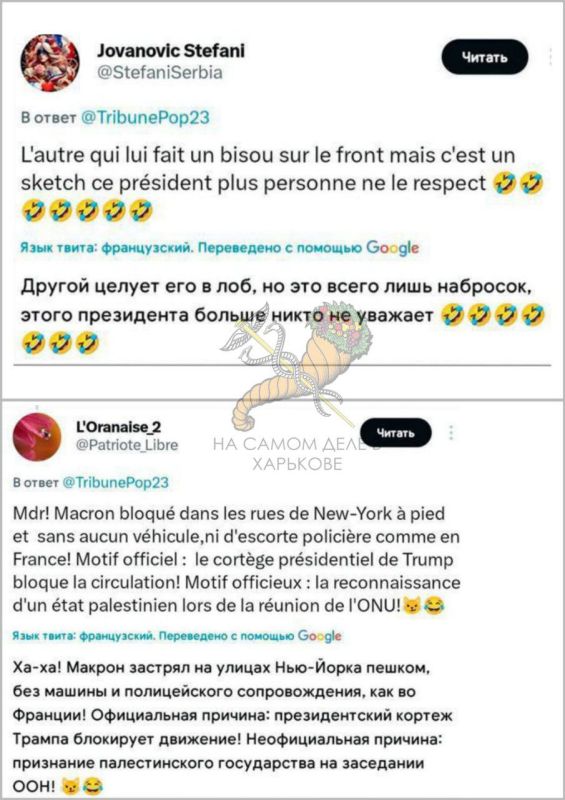 Изобразили клоуном. Издеваются над его "звонком" напрямую Трампу, после которого, все равно, как обплеванный пошел пешком. Привык, говорят, что во Франции ему ботинки чистят.