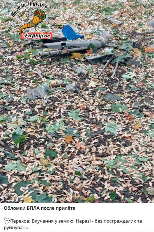 В Киевском районе Харькова прозвучал взрыв. УкрСМИ пишут, что БПЛА "Молния" упал на дорогу и опубликовали фото дрона присыпанным листьями