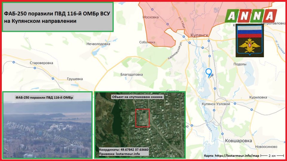 ВКС России с помощью фугасных авиабомб ФАБ-250 с УМПК нанесли удар по пункту временной дислокации 116-й ОМБр ВСУ (49.67842 37.63660) в посёлке Купянск-Узловой в зоне ответственности ГрВ "Запад" в Харьковской области