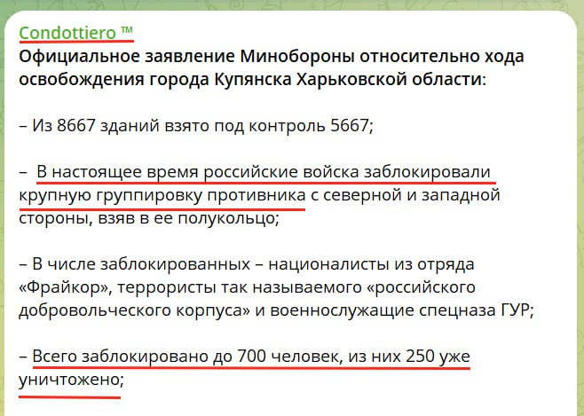 Причем, эти же самые каналы (см. скрины) еще десять дней назад повторили за официозом МО РФ (а тот в свою очередь взял это из отчетов командования группировки), что на 23.09.25 группировка ВСУ в Купянске УЖЕ БЫЛА НЕ ТОЛЬКО ТАМ ЗАБЛОКИРОВАНА, но и потеряла уничтоженными 200 из 700 человек.