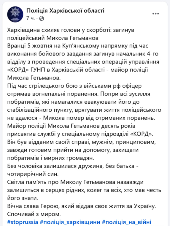 На Купянском направлении ликвидирован майор спецподразделения "КОРД" нацполиции Украины Николай Гетманов.