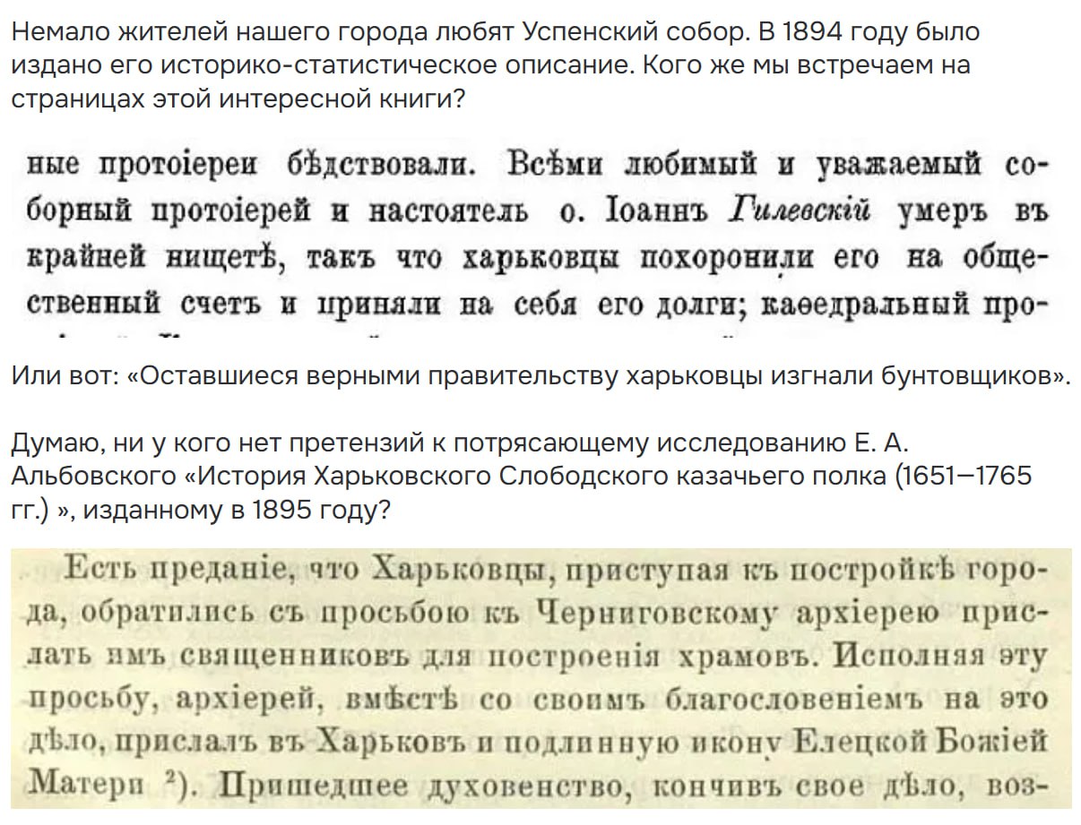 Каким местом читают архивные документы или писания эти йододефицитные, если вообще их читают? Вопрос риторический, конечно. Найдите хоть одно упоминание "харківці". Не не найдете! Потому что такого слова нет"! Наши предки называли себя "ХАРЬКОВЦЕМИ". Да-да, исключительно русским словом! Имперским, мы бы сказали.