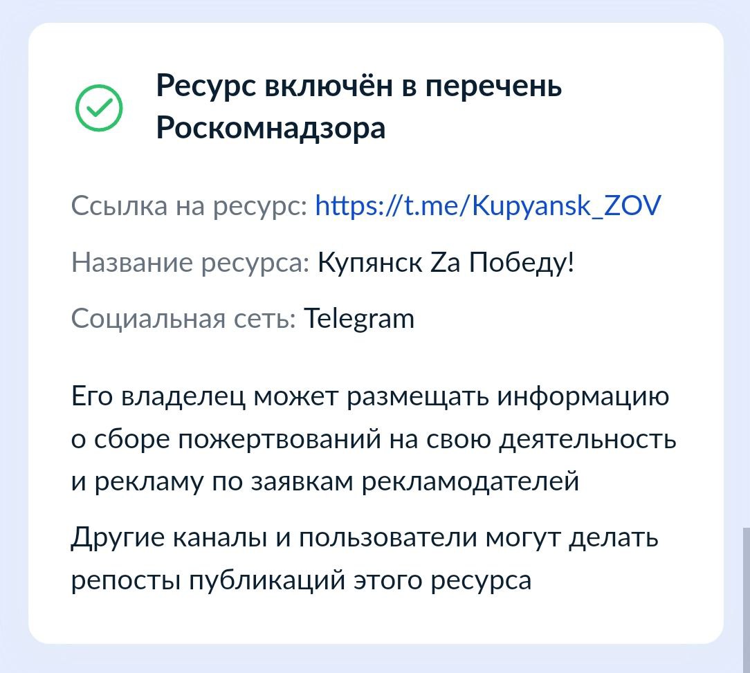 Наш канал Купянск Za Победу! теперь в реестре Роскомнадзора (РКН)