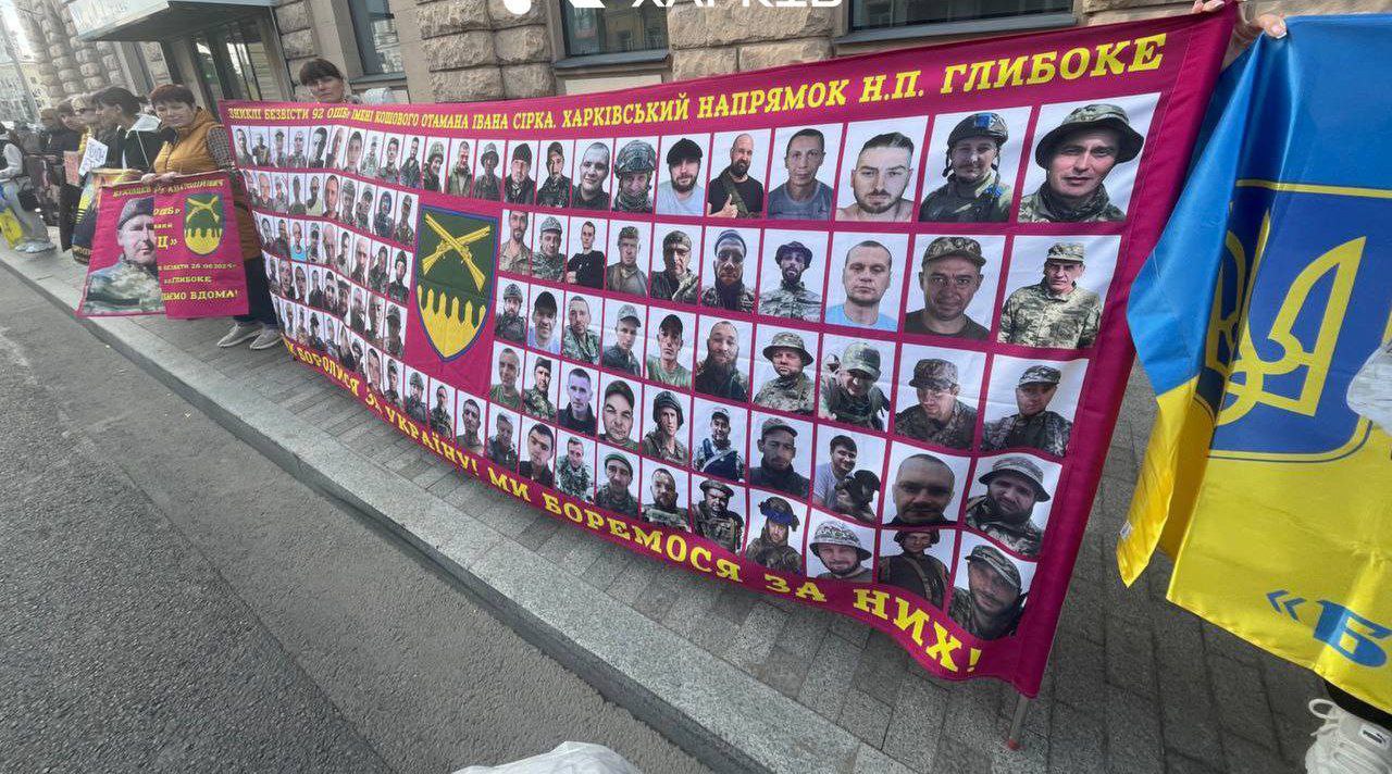 На плакате – потери (без вести пропавшие, по факту погибшие) 92 ОШБр в боях за с. Глубокое Харьковской области, родственники вышли на протест с требованием установления реальной судьбы военнослужащих и предоставления помощи семьям.
