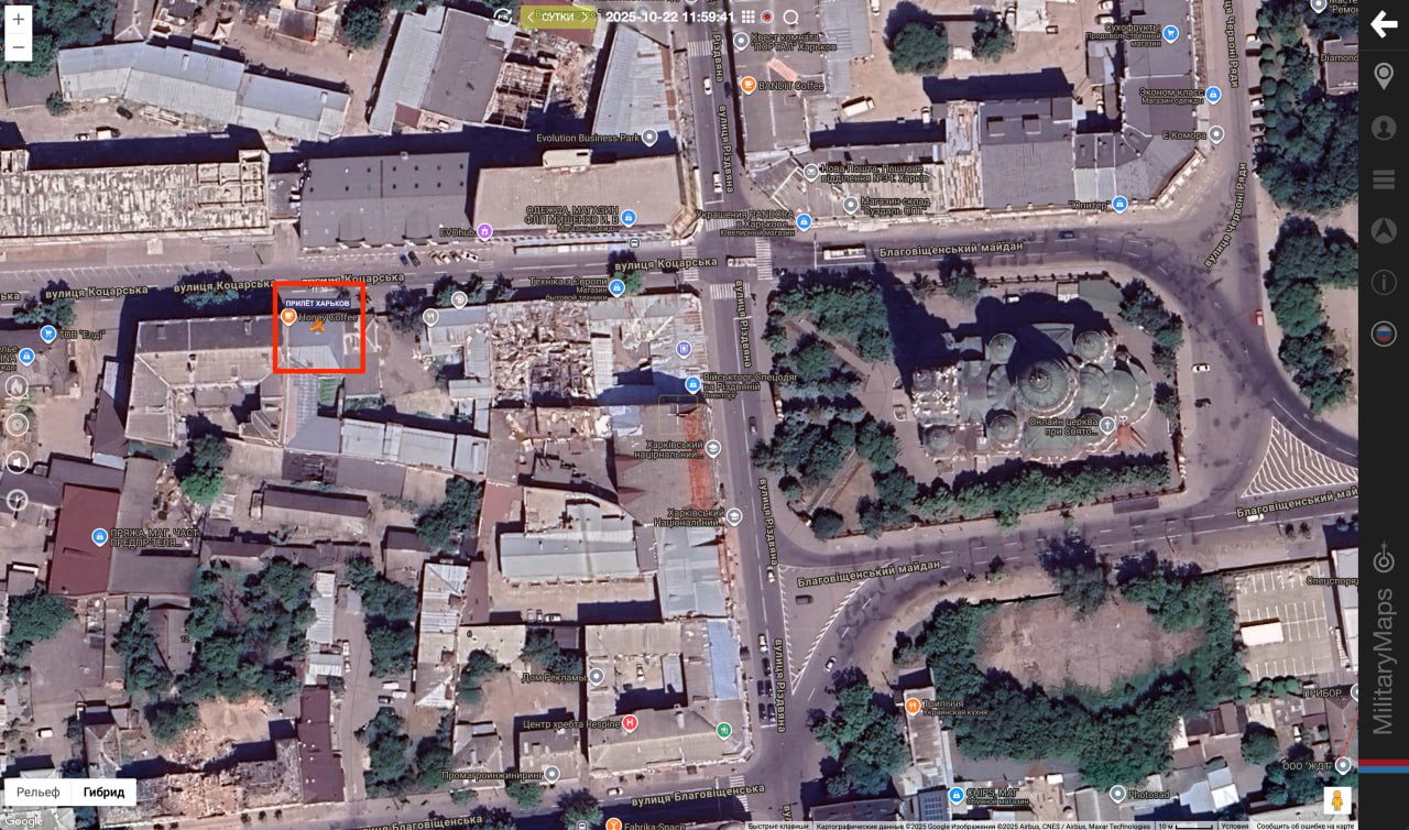 *в соседнем здании находится военторг и туда уже прилетало. Последствия видны на спутниковых снимках Google Maps