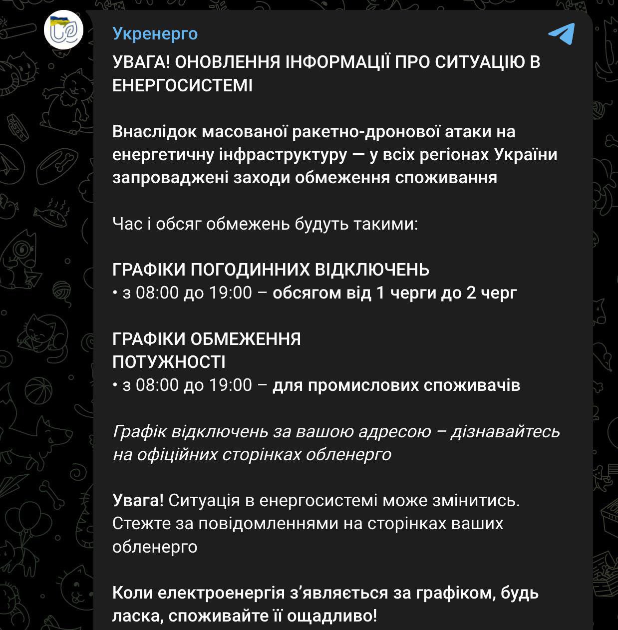Укренерго: Во всех регионах Украины введены графики отключений света с 08:00 до 19:00 — от 1 очереди до 2 очередей.