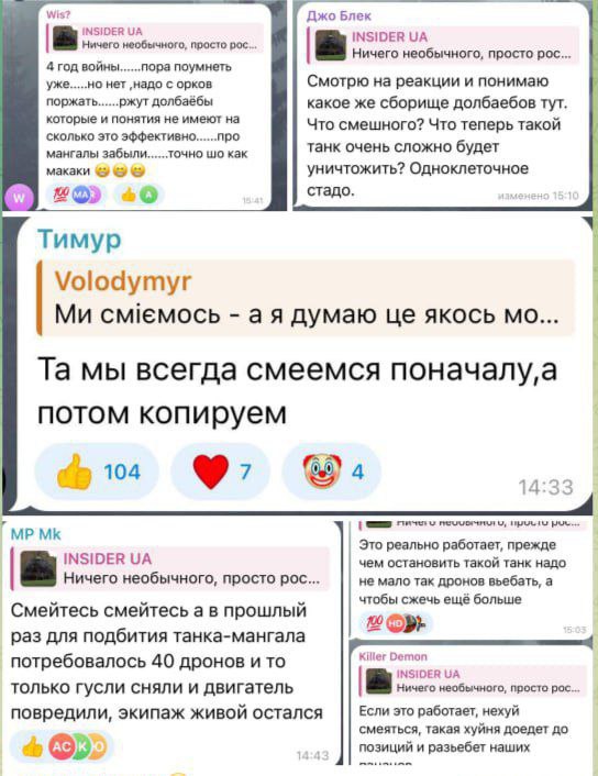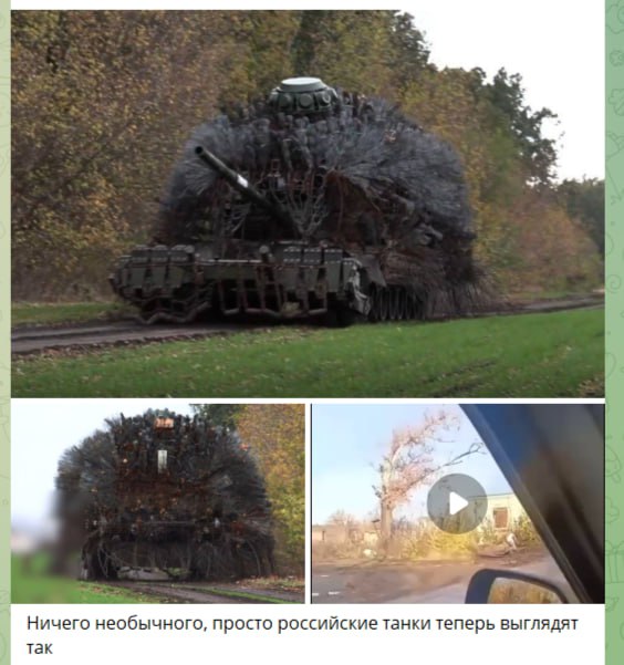 Украинские паблики решили посмеяться над русским танком, который обшили защитой от дронов всем, что попалось под руку.
