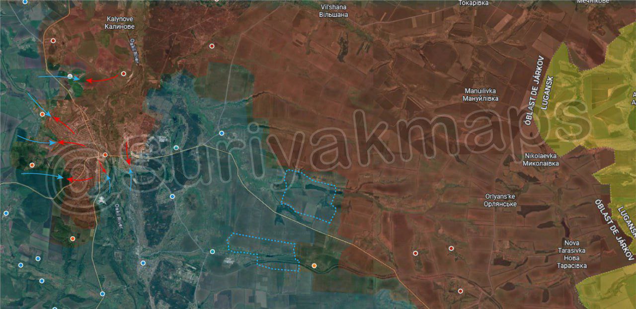 Положение на северо-восточном фронте: На Дворичанском направлении российская армия продолжила наступление к окраинам Дворичанского, которое окружено с трёх сторон. Тем временем на Купянском направлении ситуация остаётся изменчивой: в городе Купянске серая зона продолжает расширяться в восточной части по мере обострения боёв с украинской армией, которая упорно продолжает свои атаки в западной части с целью нарушения российских линий снабжения. Однако восточнее ситуация прояснилась: украинским войскам удалось вновь закрепиться в Куриловке, в то время как Песчаное остаётся в серой зоне. Кроме того, недавние российские обстрелы позволили скорректировать линию фронта к юго-востоку от Петропавловки в пользу украинских сил.