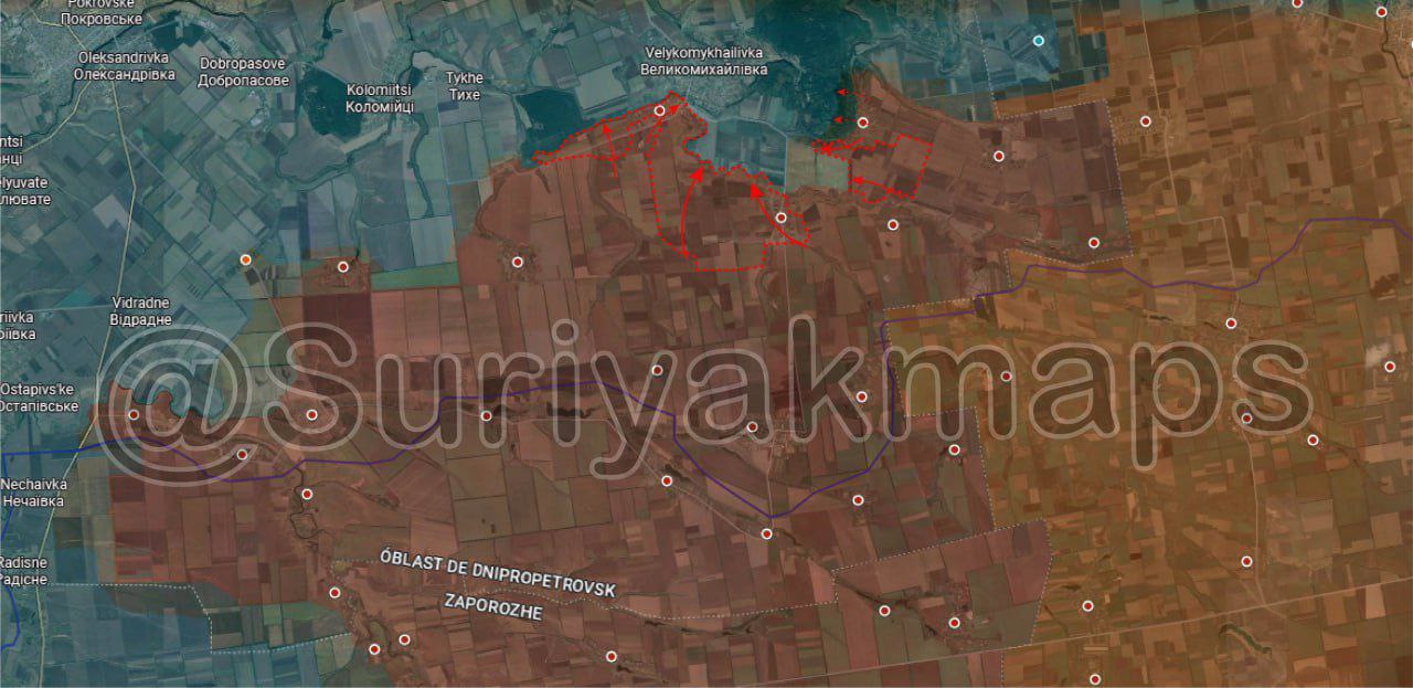 Положение на Великомихайловском направлении: Российская армия установила полный контроль над населённым пунктом Орестополь и всем южным берегом Волчьей реки напротив населённого пункта Великомихайловка. В результате этого продвижения российские силы вновь взяли Сосновку и полностью закрепили за собой Новосёловку с юга. Более того, российские войска переправились через Волчью реку к западу от Новосёловки и вошли в лесной массив.