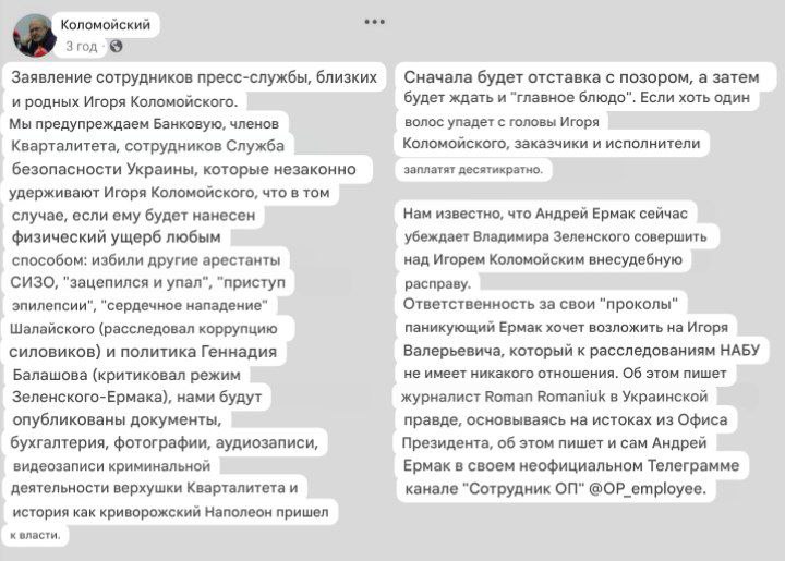 От пресс-службы и родных Бени поступило заявление, что если с патроном что-то случится, они опубликуют документы криминальной деятельности 95-го квартала и то как наркоманчик пришел к власти. В заявлении говорится, что Ермак убеждает Зеленского совершить расправу над Беней, дабы возложить всю вину за пленки Миндича на Коломойского, который никакого отношения к этому не имеет.