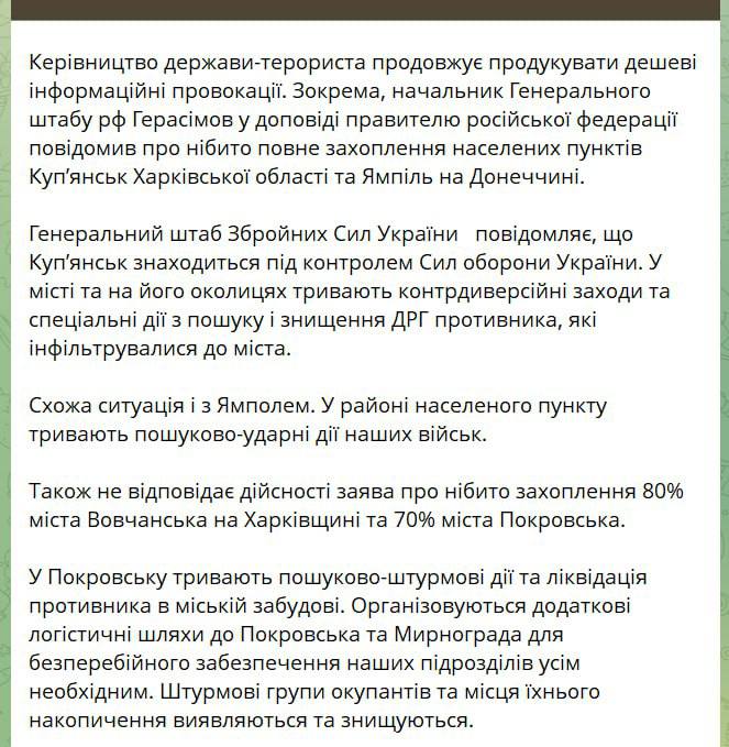 Командование ВСУ очухалось только ближе к ночи и бросились опровергать данные Генштаба ВС РФ по фронту, заявив, что и Ямполь, и Купянск контролируют ВСУ, а в населенных пунктах «работают российские ДРГ».