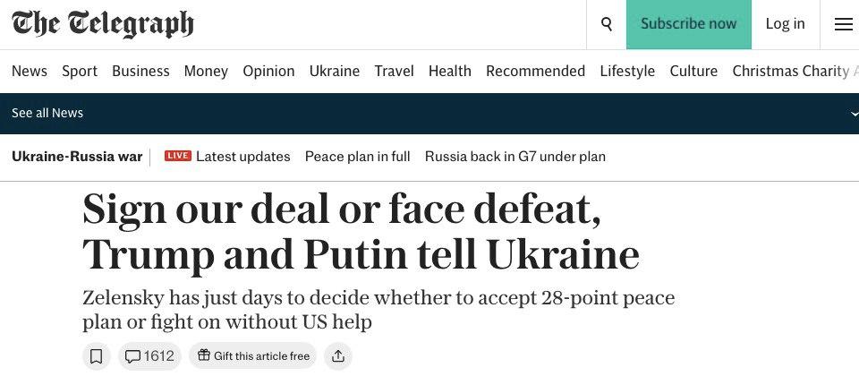 The Telegraph: Подпишите наше соглашение или потерпите поражение, говорят Трамп и Путин Украине.