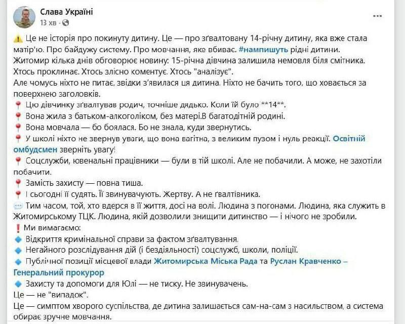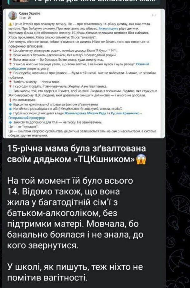 В Житомире 14 — летнюю девочку изнасиловал собственный дядя-ТЦКашник.