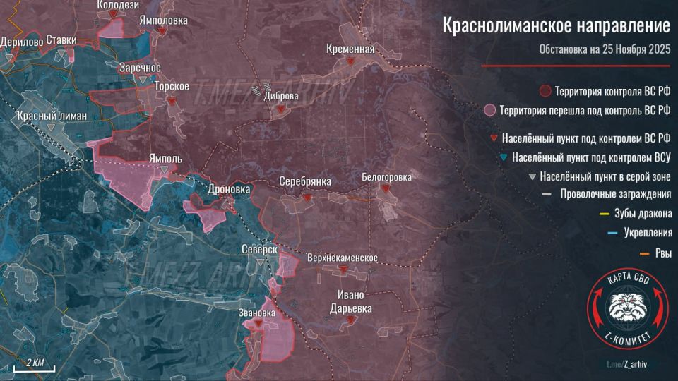 Наступательные действия ВС РФ на Харьковском и Краснолиманском направлениях, а также к северу от Часов Яра развиваются в сторону населённых пунктов Марково и Новомарково.