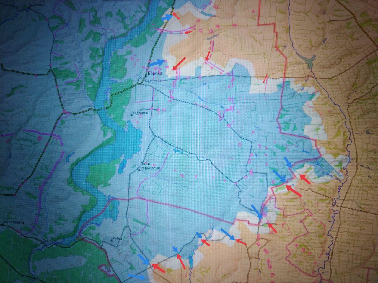 По данным Юрия Котенка, подразделения ГрВ «Запад» продолжают наступление в сторону Боровой. После удержания Загрызово, Кругляковки и Колесниковки и взятия Боровской Андреевки наши силы расширили прорыв второго рубежа обороны ВСУ и выбили противника с одного из опорных пунктов у Лиманской балки.