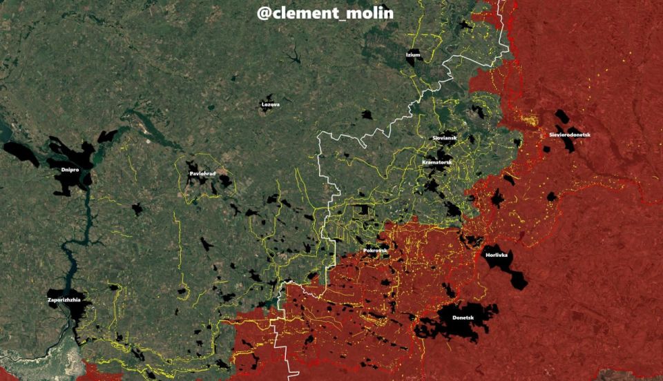 Желтыми линиями на карте отмечены линии укреплений противника. Как не сложно заметить, основная их часть и наибольшая плотность располагается как раз на оставшейся под контролем ВСУ части ДНР.