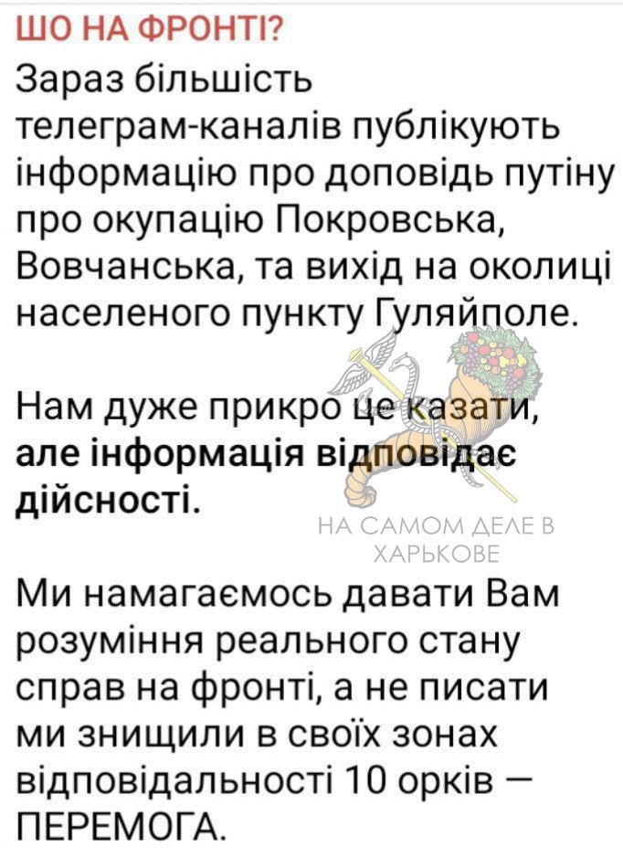Еще один украинский околовоенный канал подтверждает, что доклад Путину об освобождении Волчанска, Покровска и выход к Гуляйполю — это все правда;