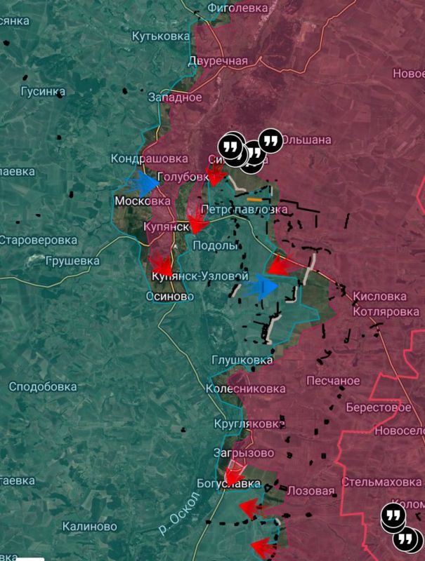 Ввиду того, что основная заблокированная группировка ВСУ в Купянске отрезана от снабжения, и мы также у Соболевки расширили зону контроля на том участке, где хохлы проводили контратаки, помимо этого, мы расширили зону контроля территории у Кучеровки и севернее Песчаного, противнику пришлось крайне сложно растягивать силы на такой большой территории, для предотвращения нашего наступления.