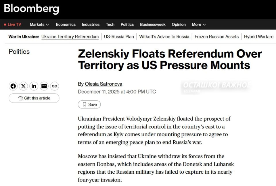 Главарь киевского режима заявил о намерении провести референдум по ключевым территориальным вопросам, — пишет Bloomberg.