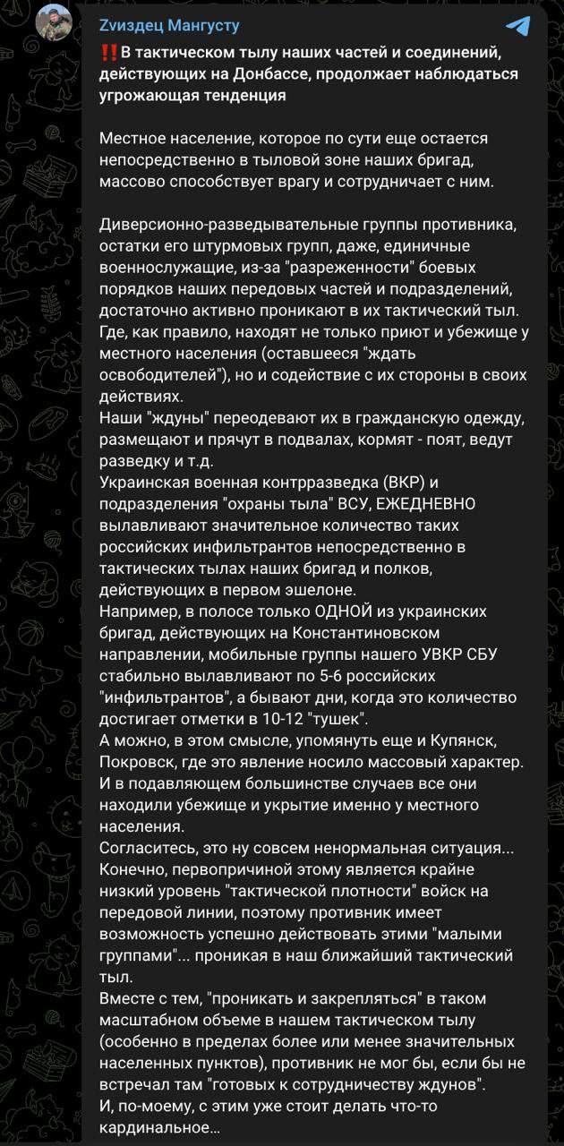 Украинский военный эксперт Машовец жалуется, что в прифронтовой зоне местное население не просто ждет Россию, но и активно помогает русским военным проникать в города и тыл ВСУ, укрывает их, кормит и поит и помогает разведкой. Говорит, даже в Купянске это массово.