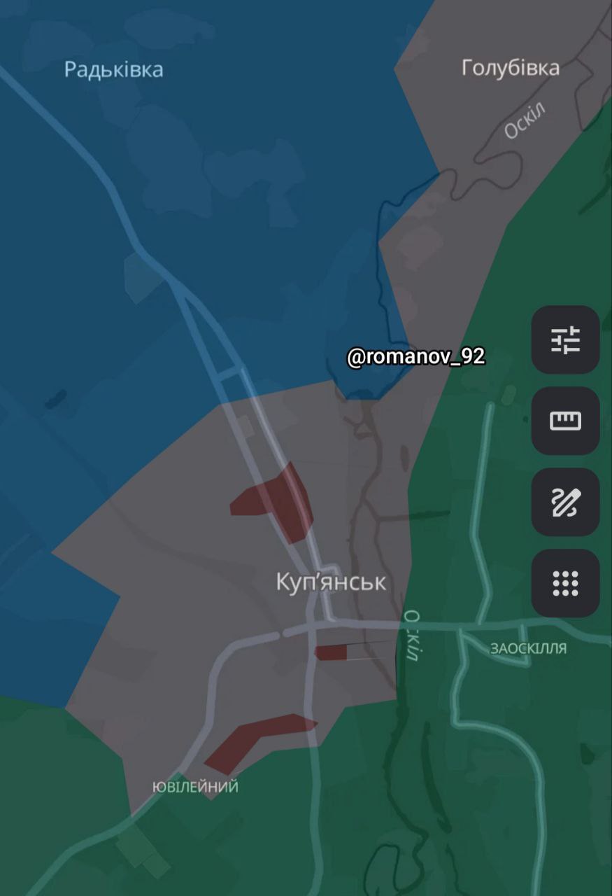 Роман Сапоньков: Мониторинговые ресурсы противника дают вот такую карту по Купянску, с очагами сопротивления внутри блокированного города