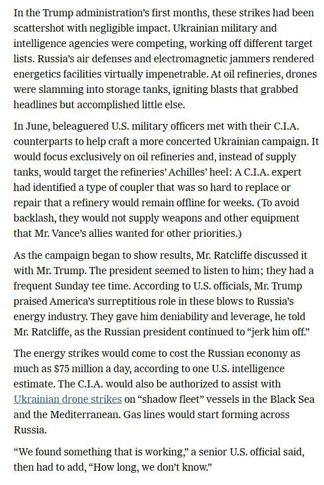 Согласно публикации The New York Times именно ЦРУ координируют и планируют удары по российским НПЗ и другим инфраструктурным объектам. Директор ЦРУ Джон Ли Рэтклифф, поддерживающий Украину, продолжает передавать Киеву оперативные разведывательные данные.