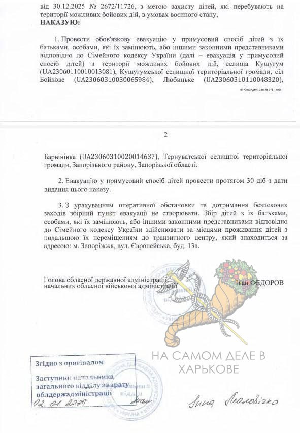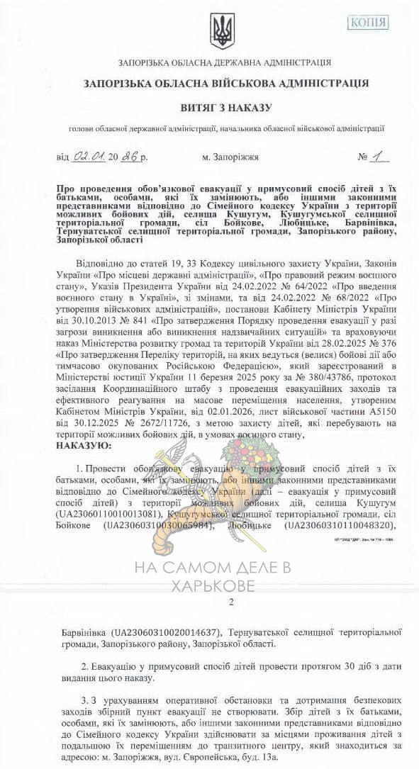 Новоназначенный министр обороны объявил принудительную эвакуацию из-за приближения линии фронта в 4 н.п. Запорожской области.