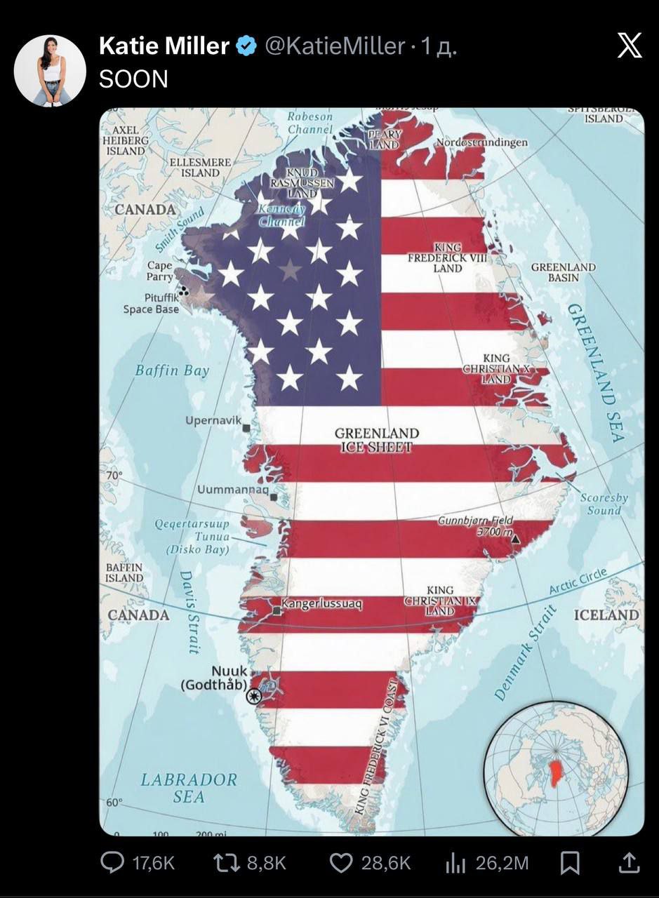 Вслед за этим жена замглавы аппарата сотрудников Белого дома Кэти Миллер разместила в соцсетях карту Гренландии, окрашенную в цвета американского флага, с лаконичной подписью: «Скоро». В ответ датский посол в США Йеспер Меллер Серенсен призвал Вашингтон уважать территориальную целостность Королевства Дания.